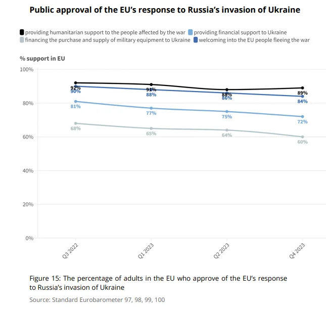 At the same time, opinion polls in the allied countries showed a moderate decline in support for providing various types of assistance to Ukraine. As of the end of 2023, 89% of Europeans approved of the provision of humanitarian aid, 84% were ready to continue accepting Ukrainian refugees, 72% were positive about continuing financial and economic support for Ukraine, and 60% were positive about providing weapons and military exercises.