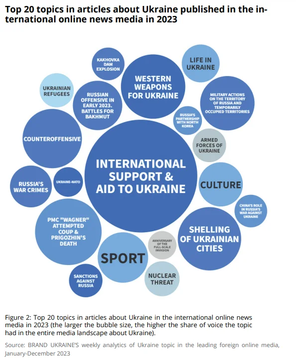 Despite a decrease in the number of media mentions, Ukraine is still considered politically and diplomatically influential in the international arena. The BRAND UKRAINE study showed that in 2023, international audiences' interest in Ukraine deepened and went beyond the war alone: only 28% of media publications concerned hostilities and the consequences of Russian attacks. Foreigners have become more interested in Ukraine's achievements in culture and sports. Among the topics that caused a particular resonance were the Eurovision Song Contest on behalf of Ukraine in Liverpool and the courageous act of tennis player Elina Svitolina, who refused to shake hands with her rival from Belarus at Wimbledon 2023.