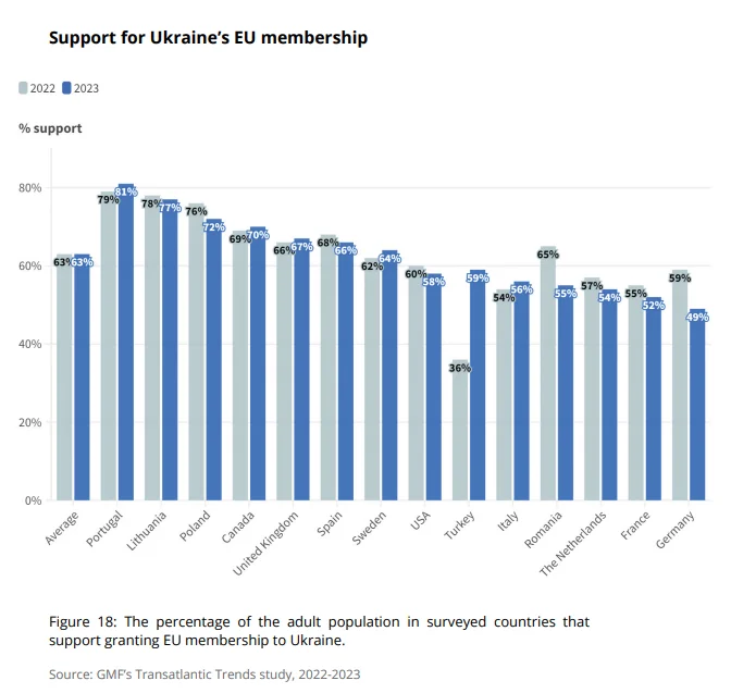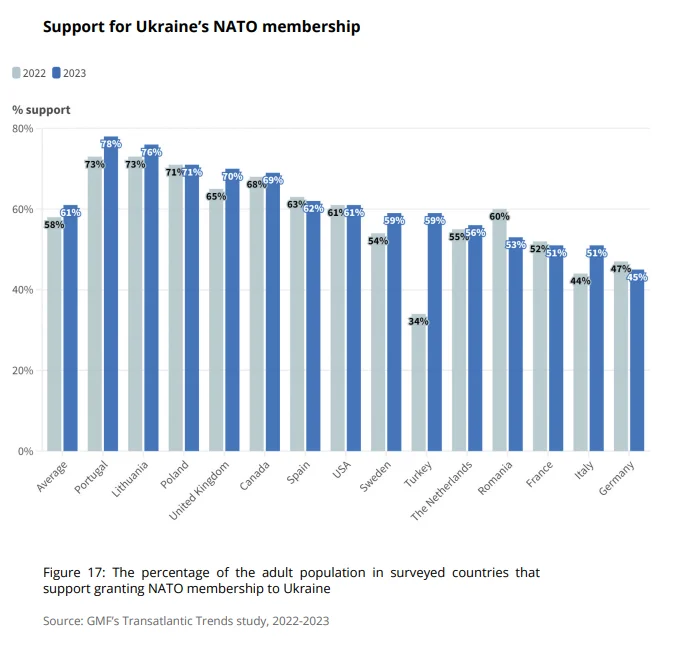 At the same time, support for Ukraine's accession to NATO has increased among the population of the allied countries from 58% in 2022 to 61% in 2023, while the number of supporters of Ukraine's accession to the EU remained the same as last year — at 63%.