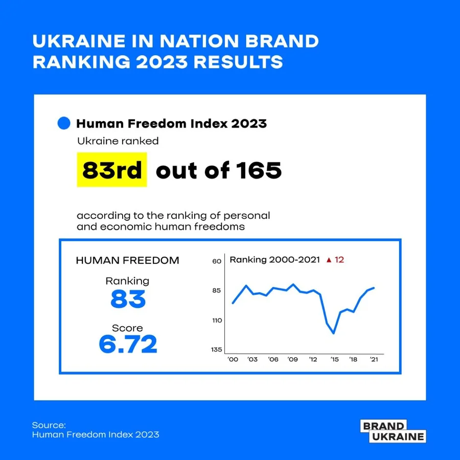 "Over the past year, we have increased six places in the Human Freedom Index and improved our scores across various parameters. This is an indicator that demonstrates that our progress in the area of human freedoms has been recognized. Given the European integration course of our country, it is important that we demonstrate better and better results in all ratings related to human rights and freedoms. Despite the positive dynamics, the ranking also highlighted areas of growth for Ukraine that need to be addressed, including business regulation, property rights protection, and police reliability," commented Mariia Lypiatska, Head of BRAND UKRAINE.