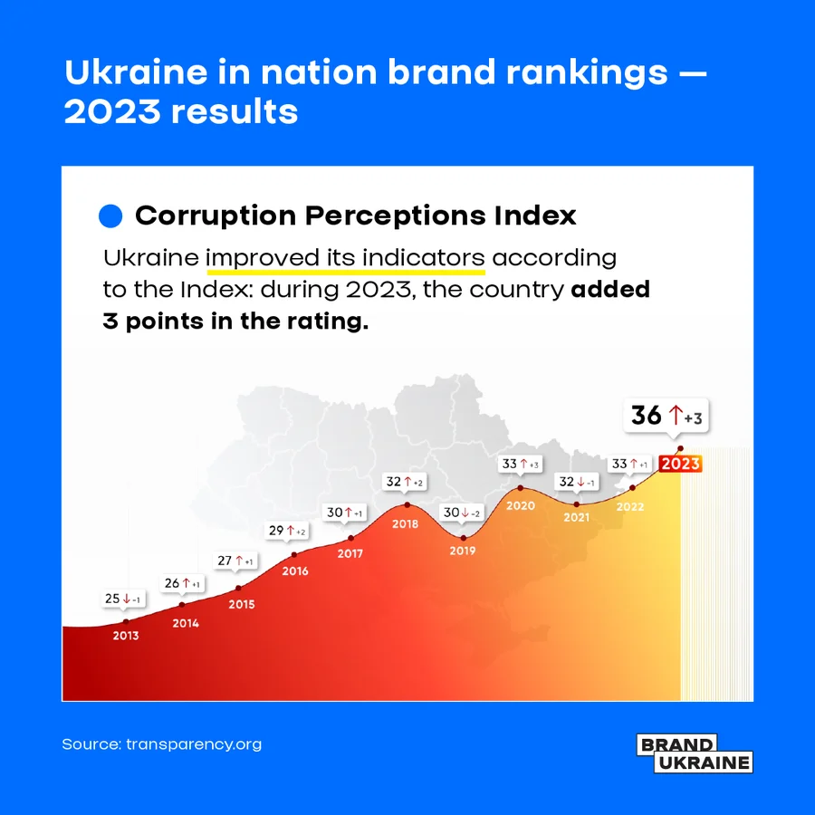 In 2023, Ukraine has 36 points out of 100 and is ranked 104th. Thus, together with the other 16 countries, Ukraine has shown its best score ever.