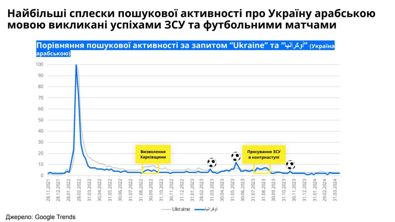 Для багатьох у регіоні MENA повномасштабне російське вторгнення вперше відкрило Україну на мапі світу. За даними авторитетного індексу м’якої сили від Brand Finance, у 2023 році обізнаність про нас у арабському світі зросла на понад 35% порівняно з 2021. Найбільші сплески пошукової активності, як правило, викликають успіхи ЗСУ на фронті та футбольні матчі.