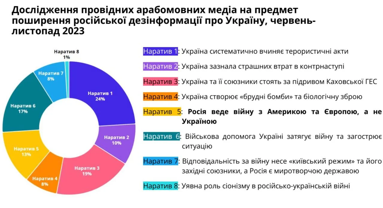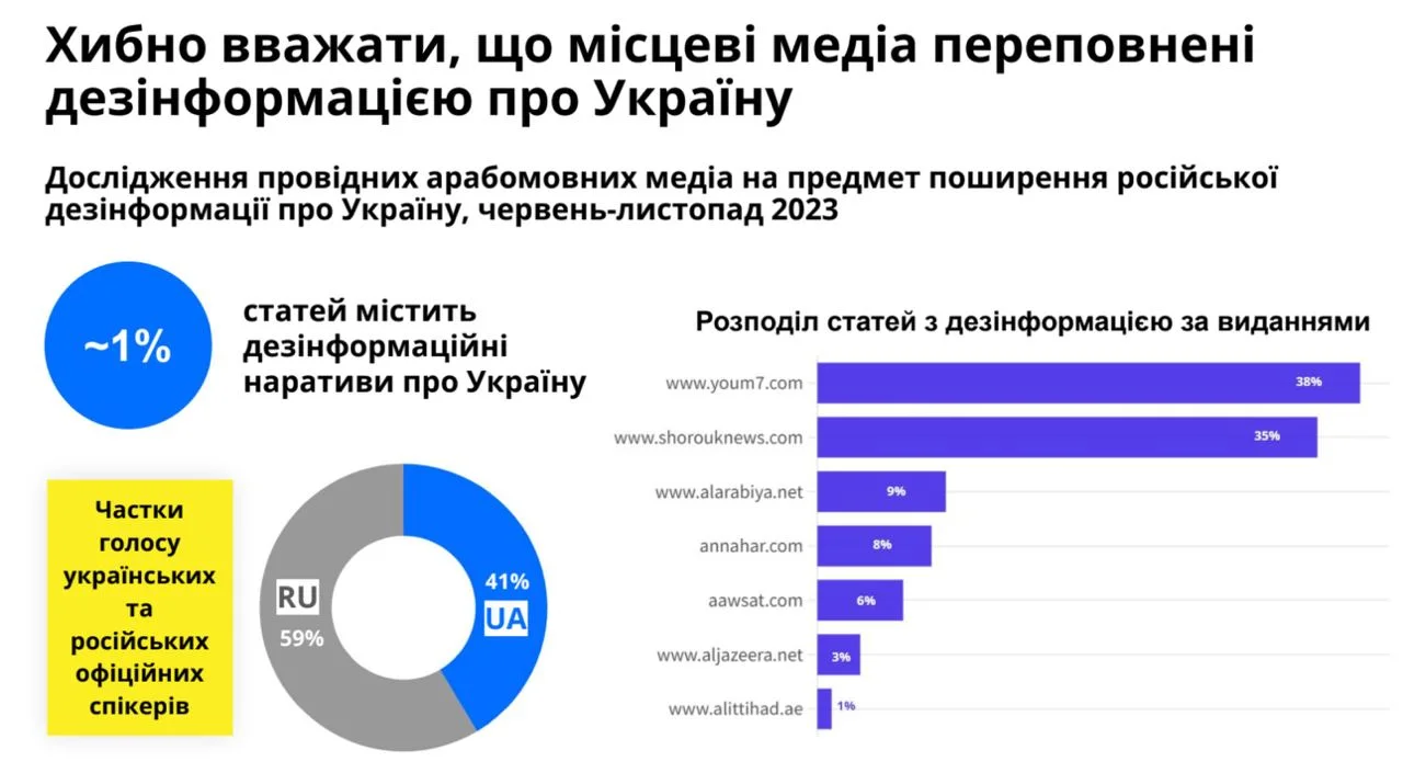 Попри значну медійну присутність Росії в регіоні (у країнах MENA функціонують потужні кремлівські медіа Sputnik і Russia Today арабською мовою), місцеві ЗМІ не переповнені дезінформацією про Україну. Дослідження провідних арабомовних медіа на предмет поширення російської пропаганди виявили, що лише 1% статей, опублікованих з червня по листопад 2023 року, містив дезінформаційні наративи про Україну. Водночас частка голосу українських і російських офіційних спікерів у новинах склала 41% і 59% відповідно, що типово і для європейських медіа.