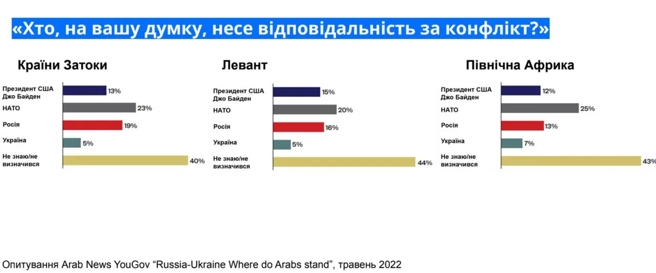 Глибоко вкорінена антизахідна філософія та власний досвід війн і збройних конфліктів впливають на уявлення країн MENA про Україну в контексті повномасштабного російського вторгнення. Понад 20% населення регіону звинувачують у війні НАТО, ще 13% — президента США Джо Байдена. Водночас 16% покладають відповідальність на Росію, а 42% не мають чіткої позиції. Про це йдеться в результатах опитування Arab News YouGov “Russia-Ukraine: Where do Arabs stand?”, опублікованих у травні 2022 року.