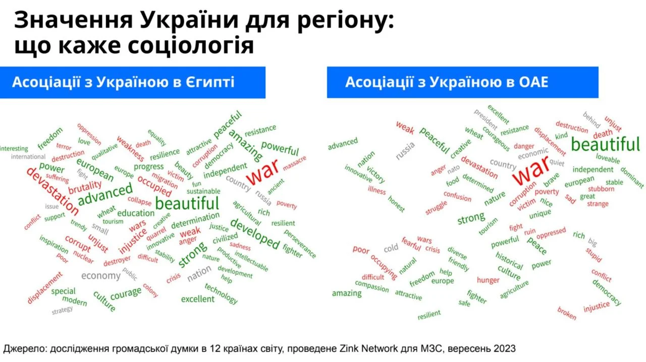 Водночас опитування Zinc Network для МЗС України від вересня 2023 року продемонструвало, що 45% населення Єгипту та 36% населення ОАЕ підтримують Україну у війні проти Росії. Ще 30% і 40% респондентів заявили про свою нейтральну позицію. Ймовірно, схожа ситуація й у інших країнах регіону. За словами Максима Субха, спеціального представника України з питань Близького Сходу та Африки, “Україну ніхто не вважає ворогом на Близькому Сході чи в Північній Африці”. Усупереч культурним відмінностям, нас “шанують і люблять”.