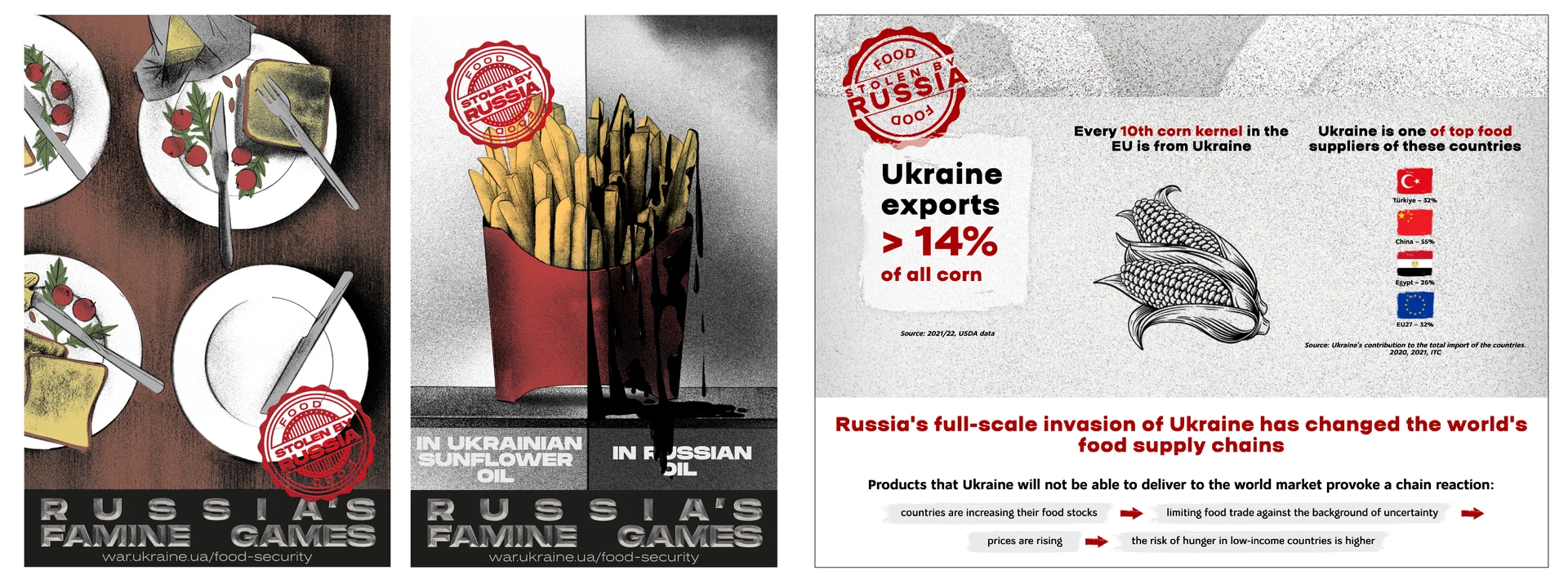 «Голодні ігри» Росії — це метафора для комунікацій України щодо усіх ворожих дій Росії, спрямованих на поглиблення світової продовольчої кризи, з особливим наголосом на викритті шантажу та використання їжі як зброї. Ідея кампанії полягає в тому, щоб за аналогією з грою на виживання пов’язати повномасштабну агресію Росії проти України та її негативний вплив на дефіцит продовольства в найбільш вразливих регіонах світу.
