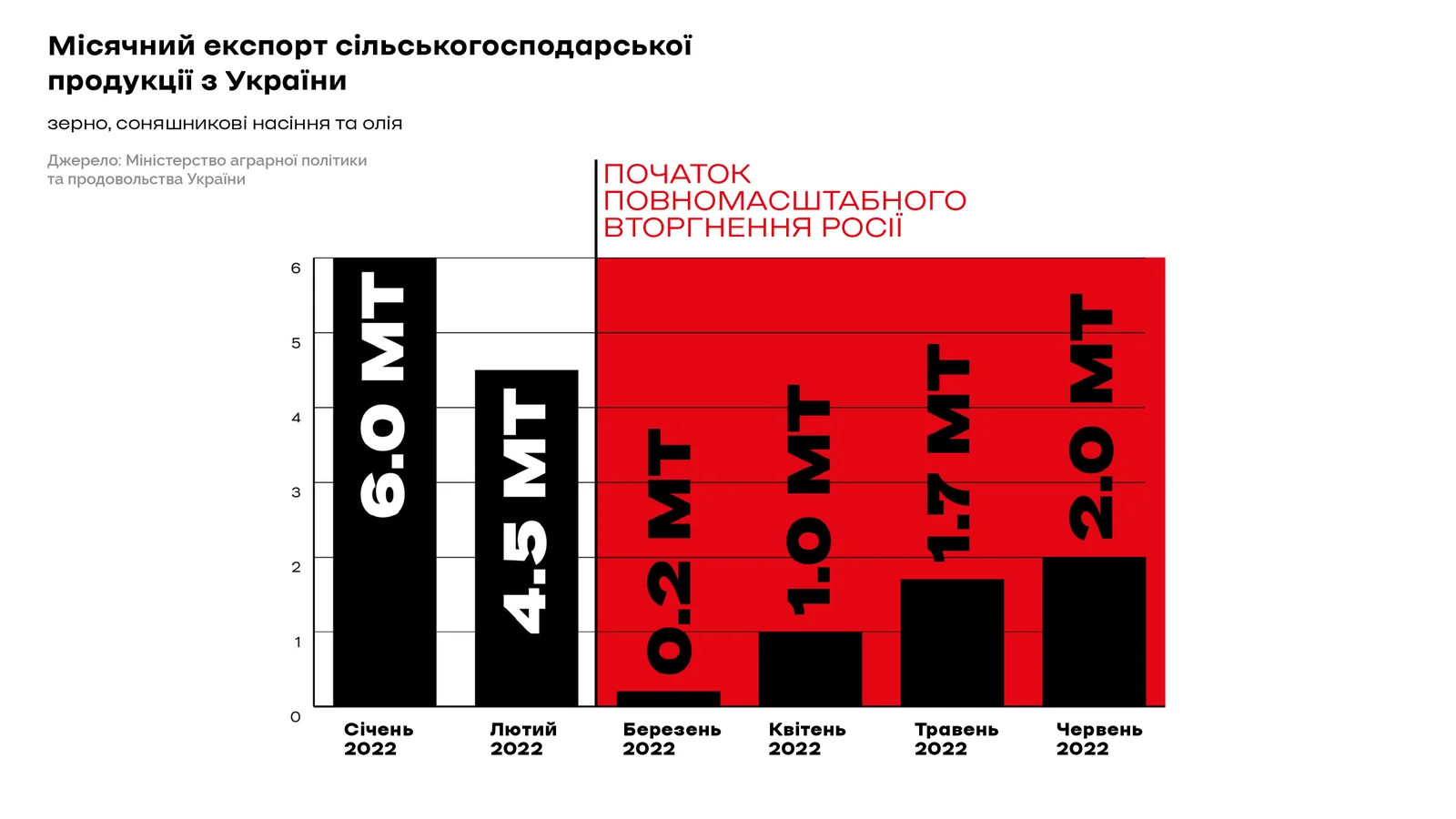 Скорочення експорту продовольства з України через повномасштабну війну Росії стало важким ударом по стійкості глобальної продовольчої системи, що зазнала суттєвих уражень і досі не відновилась від наслідків пандемії COVID-19. Руйнування Росією агропромислової інфраструктури та логістики України має цілеспрямований і систематичний характер: від ракетних ударів по елеваторах до блокування морських портів і викрадення зерна та сільгосптехніки. Це призвело до різкого скорочення обсягів пропозиції на світовому ринку продовольства та стрімкого зростання цін на основні культури. Через війну в Україні Всесвітня продовольча програма ООН втрачає близько 50% поставок зерна. Росія навмисно цілеспрямовано запустила «голодні ігри» на виживання в країнах найбільш вразливих регіонів світу, щоб виторгувати геополітичні переваги на високих ставках. Використання їжі як зброї є добре відомою зовнішньополітичною тактикою Росії, подібною до того, що Росія протягом багатьох років використовує у постачанні енергоносії.