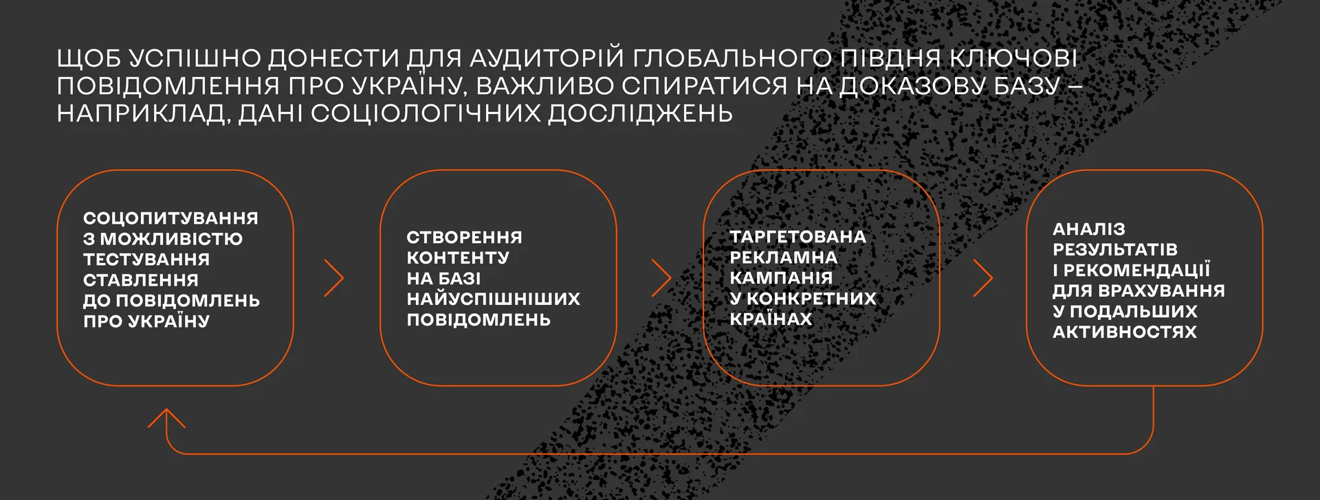 На основі даних соціологічного дослідження у вищезгаданих країнах ми сформували перелік ключових повідомлень про Україну, що довели свою успішність у зазначених країнах і сприяли більш позитивному ставленню респондентів до України. Ці повідомлення ми перетворили у креативний контент для соцмереж і протестували його завдяки таргетованій рекламній кампанії в семи країнах.