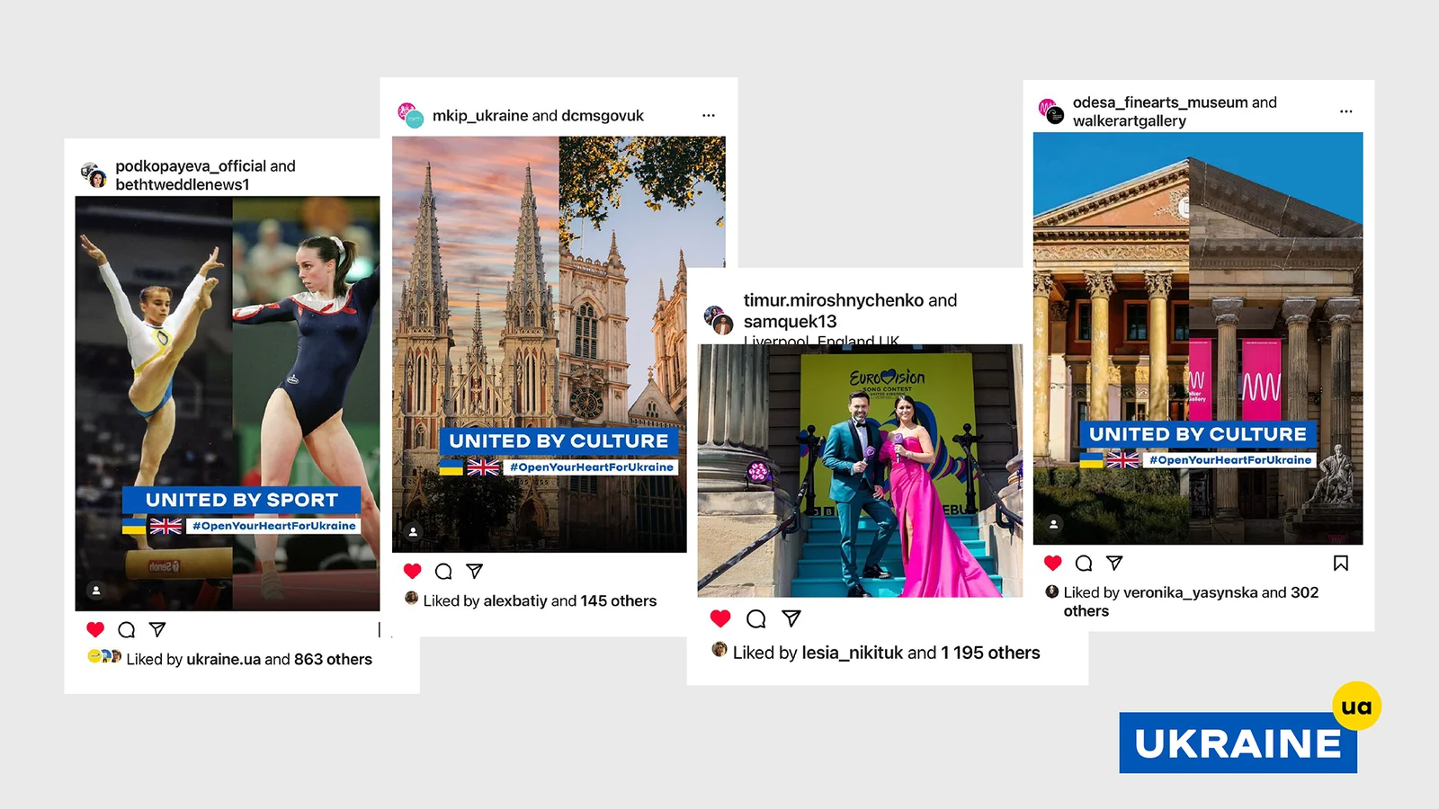 #TheUnityWave розпочалася зі спільної публікації @ukraine.ua та @lovegreatbritain (офіційні профілі відповідних країн в Instagram). Ця хвиля стала особливим і символічним моментом кампанії, оскільки її формат відкрив для партнерів з України та Великої Британії можливість поділитися спільним меседжем і підкреслити важливість солідарності перед фіналом Євробачення.