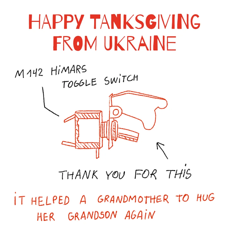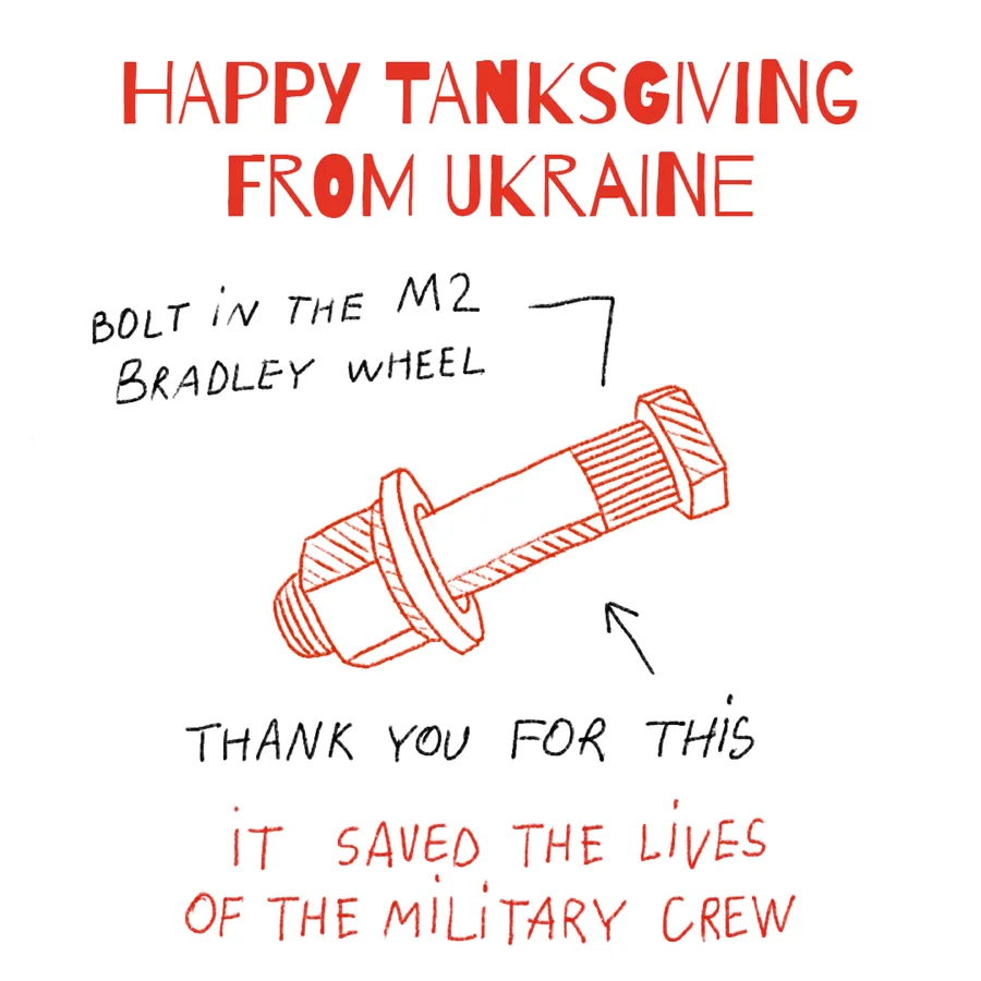 Подяка — це щирість, тому наш арт-директор вирішив намалювати листівки подяки вручну. Так виникла ціла серія листівок. Основний акцент зроблено на елементи військової техніки, яка врятувала життя. Це метафора внеску кожного американця та їхніх податків. Результат усіх внесків разом це врятовані життя українців і наближення нашої перемоги”.